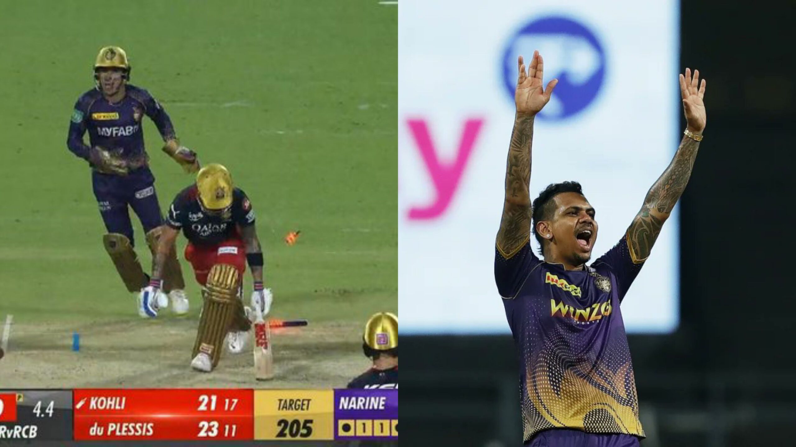மிகப்பெரிய இலக்கை சேஸ் செய்த ஆர்சிபி அணிக்கு டு பிளசிஸ் மற்றும் விராட் கோலி நன்றாக துவங்கினர். முதல் விக்கெட்டுக்கு 44 ரன்கள் அடித்திருத்தபோது, விராட் கோலியின் விக்கெட்டை தூக்கினார் சுனில் நரேன். இந்த இடத்தில் இருந்து ஆட்டம் கொல்கத்தா பக்கம் திரும்பியது.